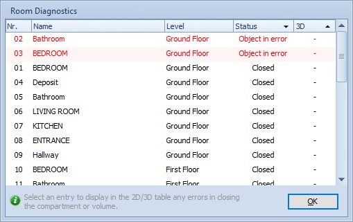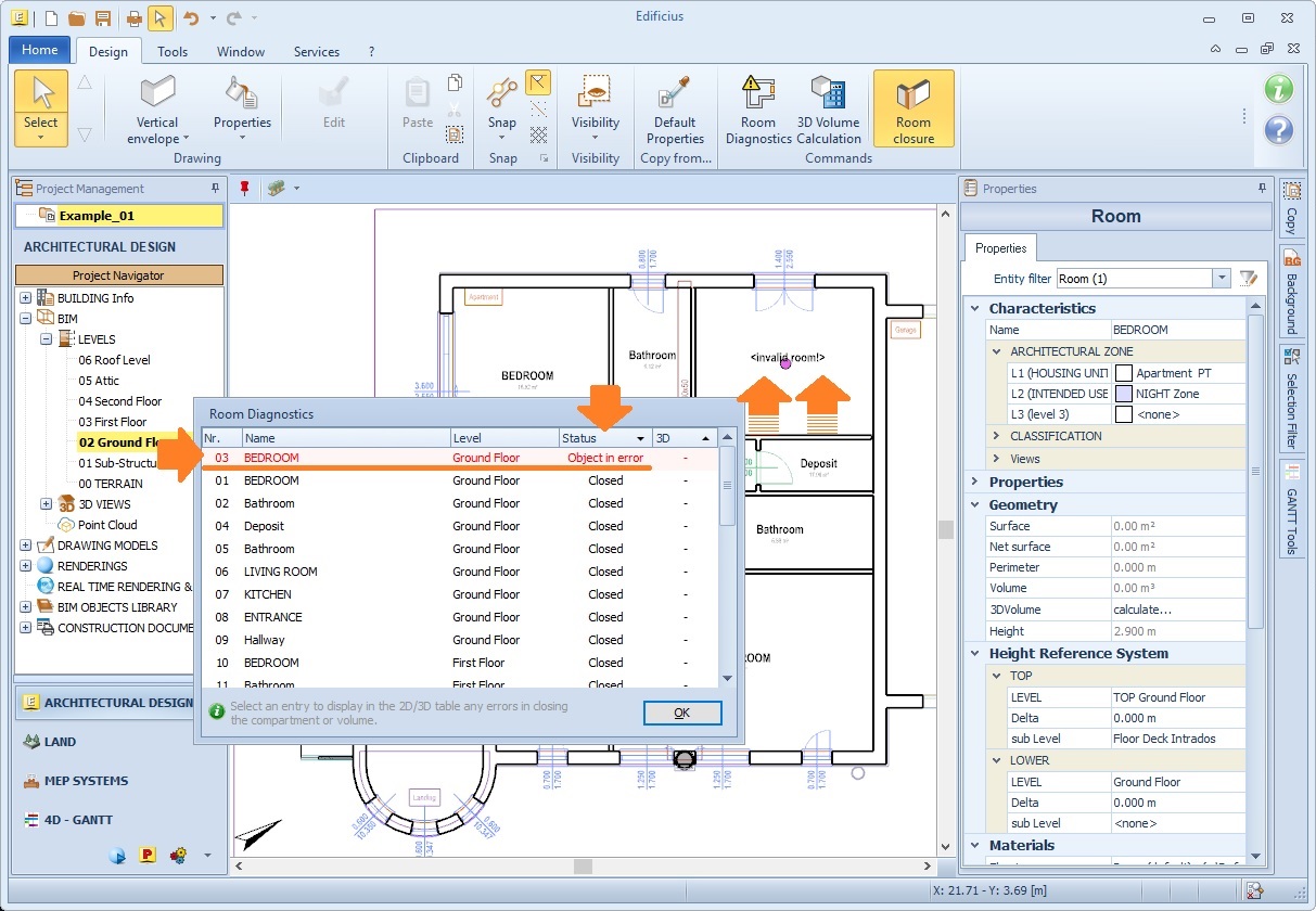 User_905162 | Room DiagnosticsUser_905162 2025-09-24 14:36:58 With the update to the new release of "usBIMe" in Edificius, a new tool called "Commands" has been added for the object "Room." To activate it, you need to select a Room, either on a level or in 3D (click HERE to see an image). Inside this tool, you will find the following commands: - Room Diagnostics - a new and more powerful diagnostic tool related to the closure of the room. - 3D Volume Calculation - it calculates the volume of the room, checking for any discrepancies. - Room Closure - by enabling or disabling it, you can consider or exclude columns from the room's surface area calculation. Click HERE to see an image. In this discussion, we will focus on the "Room Diagnostics" command. Once you select the command, a diagnostic report is displayed on the screen, listing ALL the rooms in the project. Each room is identified by its number, name, and the level to which it belongs. The column Status indicates whether the room's surface is closed or not. If the room has a closed perimeter, the room's name and the square meters of its surface are displayed on the level. In the report, the "Status" column shows "closed." If the room has an unclosed perimeter, the level displays "<room in error>." In the report, the "Status" column shows "Object in error." Click HERE to see an image. In these cases, it would be advisable to resolve the lack of closure for the room. By double-clicking on the entry in the report, you will be taken to the level, to the "<room in error>." In such situations, the cause of the unclosed room should be sought in the connections between the enclosures that define the room. It's highly likely that some connection is incomplete, leading to the room's failure to close properly. Identifying the unclosed connection, correcting it, will result in the room's closure, and subsequently, the surface calculation. In the 3D column, the closure or lack thereof of the room's 3D volume is indicated, as well as whether the 3D volume has been calculated or not. The 3D volume calculation does not happen automatically. To perform it, you need to select a room and click the "3D Volume Calculation" button. So, in cases where the 3D volume calculation hasn't been carried out, the "3D" column in the diagnostic report displays the symbol "-." After the calculation is done: - If the entire 3D surface of the room is correctly closed, the "3D" column displays "calculated." - If the entire 3D surface of the room is not correctly closed, the "3D" column shows "NOT closed." It should be noted that for the 3D volume calculation to be performed for a room, its plan surface must be properly closed. By double-clicking on the entry, you'll be taken to the room indicated in the report. In this case, the room's volume is shown in 3D, highlighted in green, while the opening in the room's 3D volume is identified by a polyline. The cause of the lack of volume closure could be a partition lower than the floor or a horizontal closure that doesn't completely enclose the volume, leaving a gap. Therefore, you need to identify the cause of the lack of volume closure and correct it. Related video >>> The compartment/room diagnostics Related Discussions: ---> Building room/compartment closures: Whether to consider columns in the space enclosure calculation or not --->The 3D Volume of a Room or compartment area |