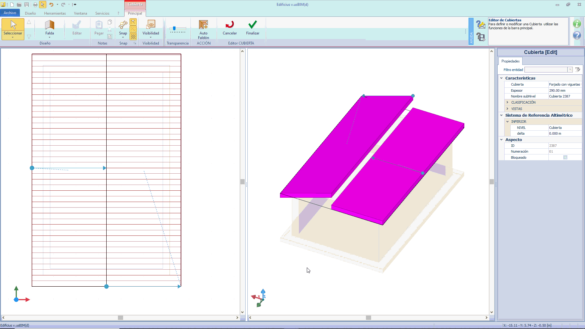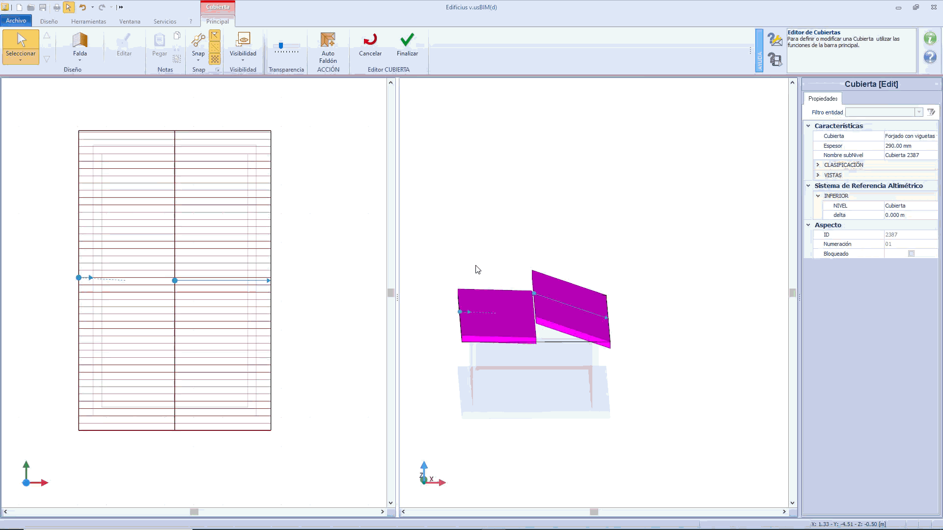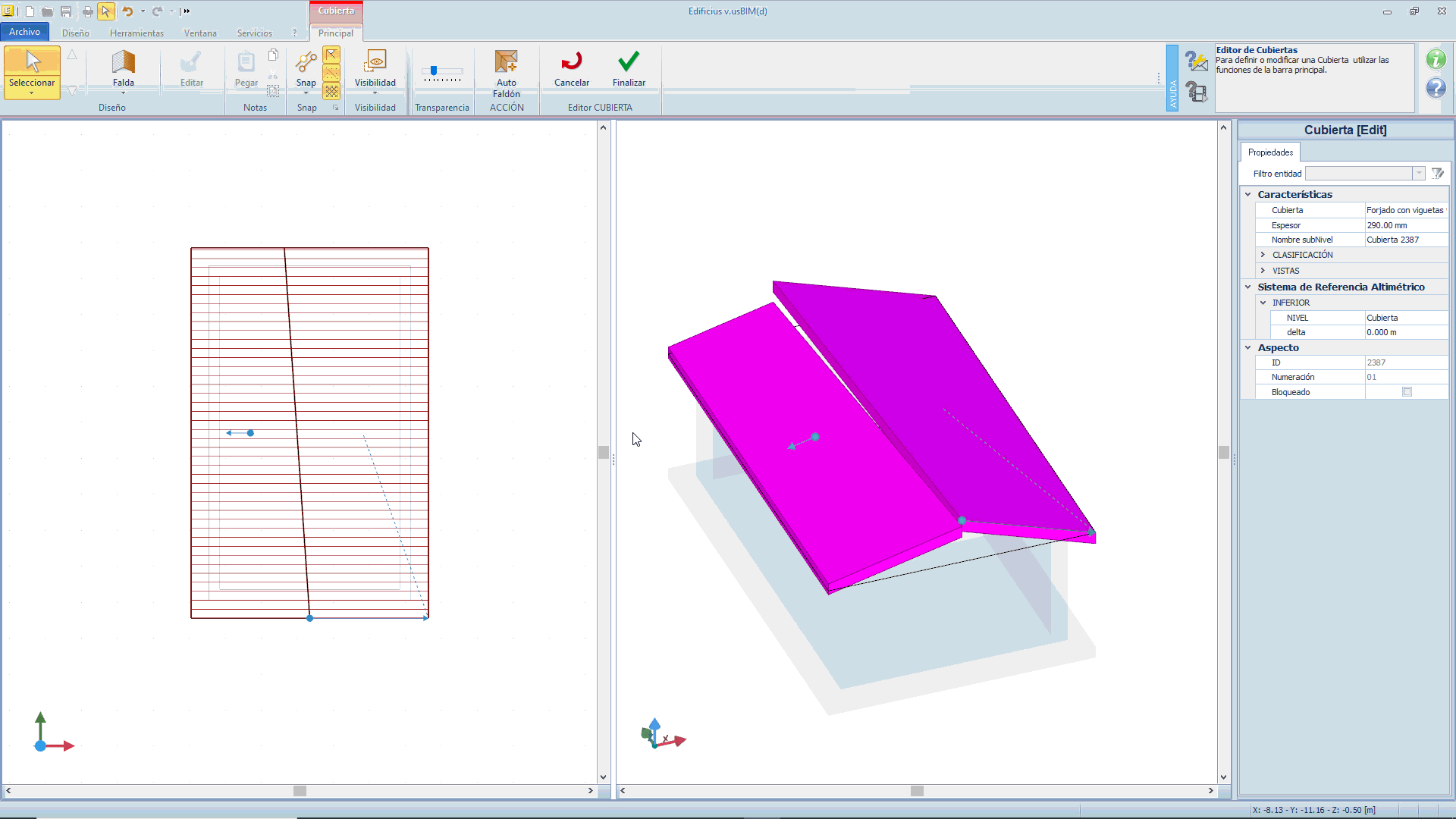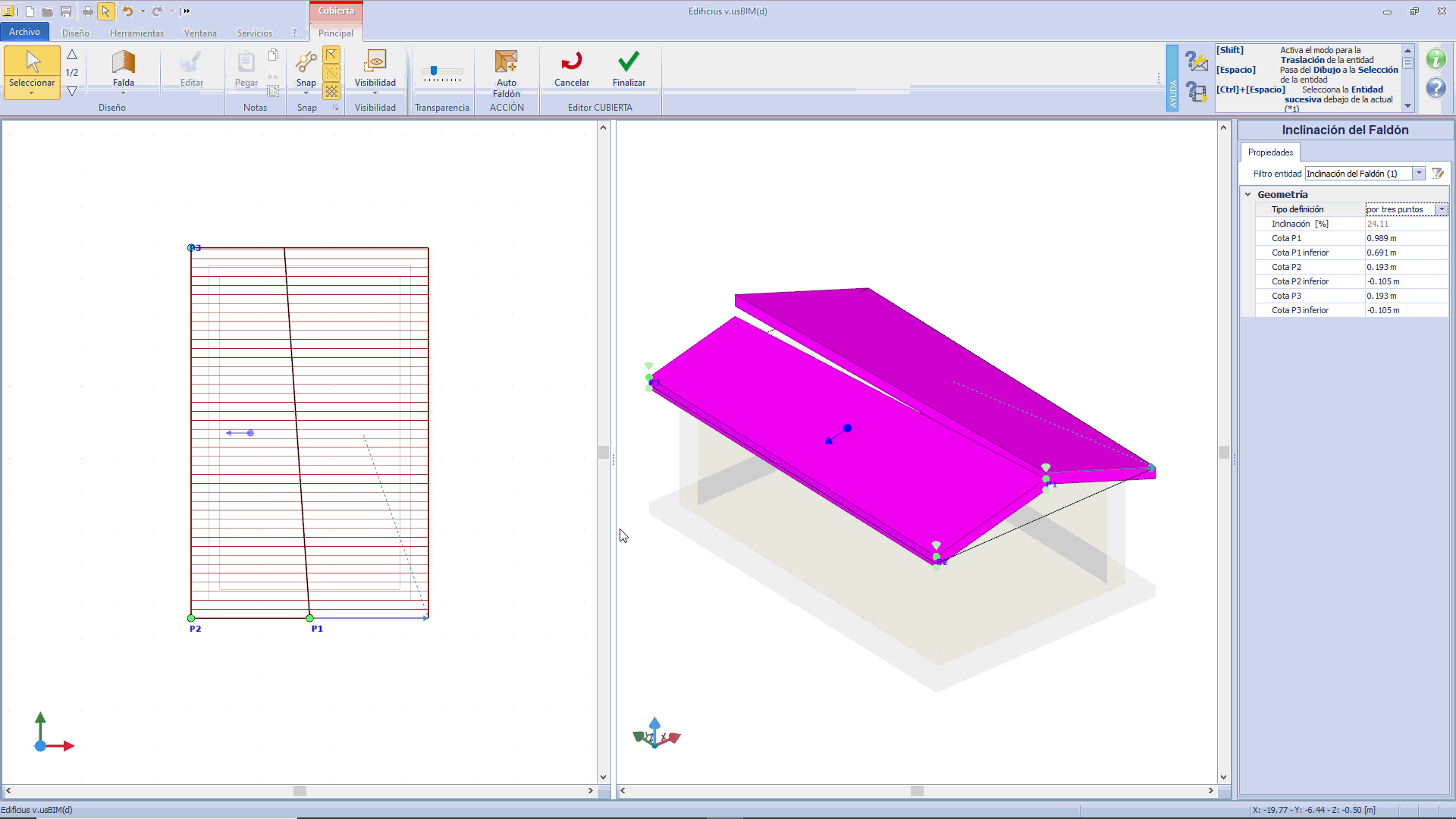 | Cubierta: los vértices de los faldones tiene cotas erradasjuanpedro 2023-08-04 16:23:16 Quiero compartir una solicitud de asistencia técnica PREGUNTA: Cómo proceder cuando al cierre del Editor de la Cubierta aparece el mensaje de error. ![]() RESPUESTA: Al cerrar el Editor de la Cubierta, se realizan algunas comprobaciones sobre el modelado de los faldones y, en consecuencia, sobre el cierre correcto del Cubierta. Uno de estos controles corresponde a la cota de los vértices de los faldones. En el caso en el que dos o más faldones adyacentes entre ellos NO tengan los vértices en las mismas cotas, aparecerá un mensaje que nos señala la anomalía. El control viene efectuado solo en el caso en el que la diferencia de cota entre los vértices de los 2 faldones sea inferior o igual a 5 mm. En caso contrario, no viene señalada ninguna anomalía. Aceptando el mensaje, se puede salir del Editor de la Cubierta, para el faldón objeto del error, no aparece en el 3D y aparecerán señalados como en error (hacer clic AQUÍ para visualizar la imagine). Para poder terminar la modelación de forma correcta de la Cubierta, debemos resolver la anomalía señalada. Para hacerlo, debemos CANCELAR el mensaje y efectuar desde la vista 3D un zoom del vértice en error, de tal forma de poder visualizar la diferencia de cotas entre los dos faldones. Visualizando la diferencia entre las cotas de los dos faldones, debemos a continuación establecer si debemos alzar un faldón o bajar el otro (hacer clic AQUÍ para visualizar la imagen) y a continuación, modificar la cota. Pero podemos encontrarnos dos escenarios diversos. Por lo que en cada caso, debemos proceder de forma diferente. ESCENARIO 1 - FALDONES de forma REGULAR En el caso en el que los faldones en objeto de la señalación tengan una forma regular, es decir, la cumbrera y el alero sean paralelos entre ellos, las inclinaciones de los faldones pueden estar atribuidas mediante las "líneas de inclinación". En primer lugar y con respecto al faldón que se identifica como a "corregir", debemos aceptar que el vértice superior de la línea de inclinación este en correspondencia con la cumbrera del faldón y de forma perpendicular a ella. Si no es así, es necesario ir a la vista en planta del faldón solapado y cambiar la posición del vértice de la línea de pendiente (hacer clic AQUÍ para visualizar un video). Una vez corregida la posición de la línea de pendiente, es necesario ir a la vista 3D y sobre el faldón cuya cota se desea corregir, enganchar el vértice alto de la línea de pendiente y mediante los snaps enganchar la cumbrera adyacente. Alineando así las cotas de los dos faldones (hacer clic AQUÍ para visualizar un video). ESCENARIO 2 - FALDONES de forma IRREGULAR En los casos en que los faldones objeto de la señalación tengan una forma irregular, es decir, que la cumbrera y el alero NO sean paralelos entre sí, por lo que la forma del faldón es trapezoidal, o tengan una forma triangular, para poder inclinar los faldones, la pendiente deberá definirse "por tres puntos". Para cambiar el tipo de pendiente del faldón, seleccione la línea de pendiente del faldón y en las Propiedades de la derecha, vaya al "campo Pendiente" y cambie de Línea de pendiente a "por tres puntos" (hacer clic AQUÍ para visualizar un video). En la vista en planta, del faldón para el que hemos cambiado la definición de la pendiente, se muestran tres puntos. Debemos seleccionar estos puntos y situar dos de ellos en la cumbrera (hacer clic AQUÍ para visualizar un video). A continuación, vaya a la vista 3D y, para el faldón, seleccione un primer punto del alero y ajústelo al alero del alero adyacente. Repita la operación para el segundo punto del alero. De este modo se alinean las cotas de los dos faldones (hacer clic AQUÍ para visualizar un video). Habrá que repetir la operación para todos los faldones que presenten vértices con cotas incorrectas. Una vez que todos los vértices se han colocado a cota correcta, el Editor de la Cubierta puede finalizar sin más señalaciones. Videos Tutoriales en relación: --> Cómo alinear la cotas de los faldones Foro de Discusión en relación: --> Cubierta: faldones superpuestos en error --> Cubierta: los vértices de los faldones tienen la posición incorrecta --> Cubierta: borde cubierta no relleno correctamente |