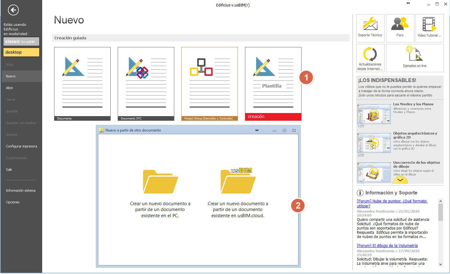 | Nuevo a partir de otro documento (Plantilla)Alexandra Vendramin 2026-01-21 11:05:19 Quiero compartir una solicitud de asistencia. Solicitud: Debo realizar un nuevo proyecto. ¿Existe una manera de utilizar información ya presente en otro proyecto sin tener que empezar desde cero? ¿Me conviene utilizar un archivo existente? Respuesta: En Edificius está disponible la función Nuevo a partir de otro documento (Plantilla), que permite crear un nuevo documento a partir de un archivo existente, presente en el PC o en usBIM.cloud, utilizándolo como plantilla. Cómo proceder: - Acceder a la Home de Edificius - Seleccionar la opción Nuevo a partir de otro documento (Plantilla) - Localizar el archivo a utilizar como referencia (puede estar en el PC o en usBIM.cloud) Preguntas: - ¿Qué información se transfiere realmente? En el nuevo documento generado se mantienen las entidades 2D y todas las configuraciones generales del proyecto utilizado como plantilla: Datos Generales, Gestión de Niveles, Planos, Niveles del terreno, Datos de instalaciones, Entidades por defecto, Planimetrías, Plantas, Secciones, Alzados, Tablas y Abacos. - ¿En el archivo también encuentro elementos paramétricos como estratigrafías, puertas, ventanas u objetos personalizados creados en el proyecto de origen? Sí. Se transfieren los elementos de la librería de objetos BIM de Proyecto que están asociados a las entidades por defecto. Por ejemplo, si se inserta una pared, en el toolbox de propiedades estarán disponibles las últimas elecciones realizadas en el archivo de origen (estratigrafías, materiales, etc.). Por lo tanto, dichos elementos también estarán presentes en la librería del nuevo proyecto. Discusiones relacionadas: --> Templates de la gráfica 2D |